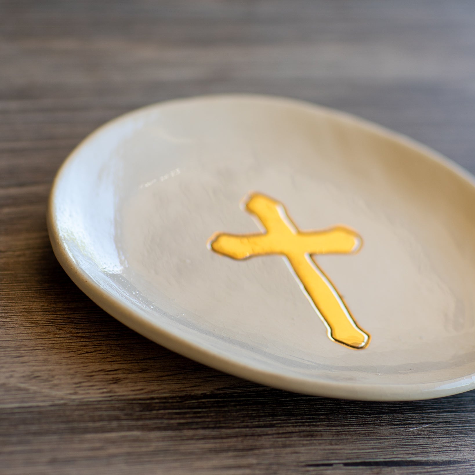 Elevate your dinner parties with our exquisite Ceramic Gold Leaf Cross Small Plate. Made from high-quality ceramic and adorned with real gold leaf, this plate adds a touch of elegance to any hosting occasion. It is perfect for serving dinner or as a decorative piece.